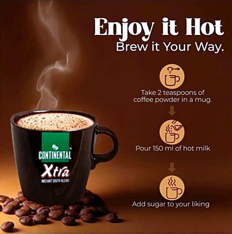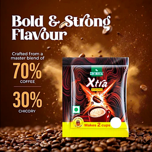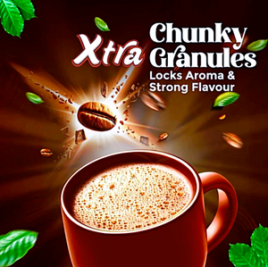 Xtra Instant Coffee Powder - South Blend is a bold and aromatic blend of 70% carefully selected coffee beans and 30% roasted chicory. This unique combination delivers a rich, strong, and flavourful cup of coffee, perfect for those who love an intense brew. The chunky granules lock in the aroma and taste, ensuring a deep and satisfying experience with every sip. Enjoy the strongest cup of instant coffee effortlessly. Simply add Xtra Instant Coffee granules and sugar to taste in hot water or milk, stir well, and indulge in a divine coffee experience anytime, anywhere.