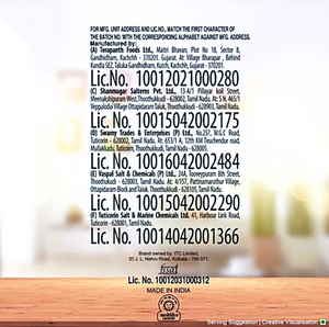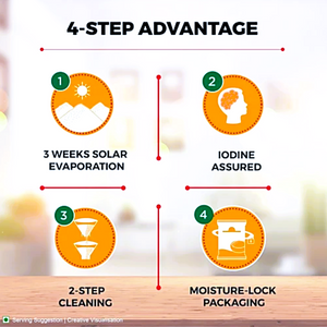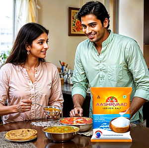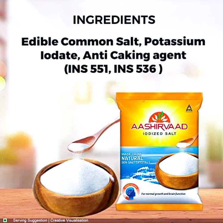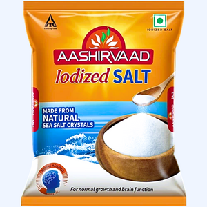 Aashirvaad ensures that only good quality ingredients reach your kitchen, and Aashirvaad Iodised Salt stays true to that promise. Made from natural sea salt crystals with a 4-step advantage process, Aashirvaad Iodised Salt ensures that you and your family receive the pure goodness of nature daily. Aashirvaad Iodised Salt is obtained by first evaporating sea water or brine in shallow basins by sunlight and wind for 3 weeks. When the water evaporates, a salt bed forms at the bottom of the basin. This salt is then collected and put through an elaborate cleansing process and finally enriched with iodine to take care of your family’s iodine requirements. The moisture-proof packaging ensures a free-flowing granular form that enables easy handling as well as clean storage. Aashirvaad Iodised Salt's 4-step advantage is what gives your meals a balanced original taste - free of any impurities. We take extra care to ensure that only quality salt reaches your home, simply because we know that it is the only way you would have it!.