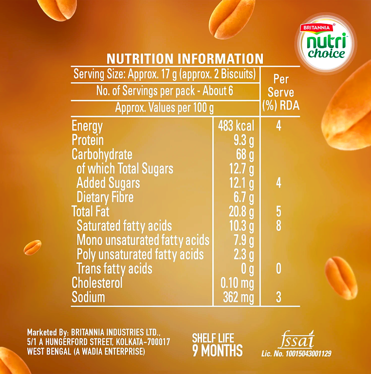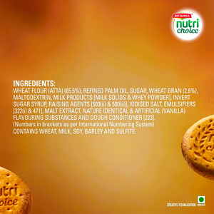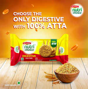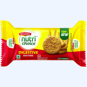 Britannia NutriChoice Digestive Biscuits are fibre-rich biscuits packed with the richness of wheat flour (atta) and bran. With every bite, you experience the coarseness of this fibre-rich biscuit. These Digestive cookies are baked to precision, making them a great snack option. Available in a large pack with 50 g free. Go ahead and make a good choice.