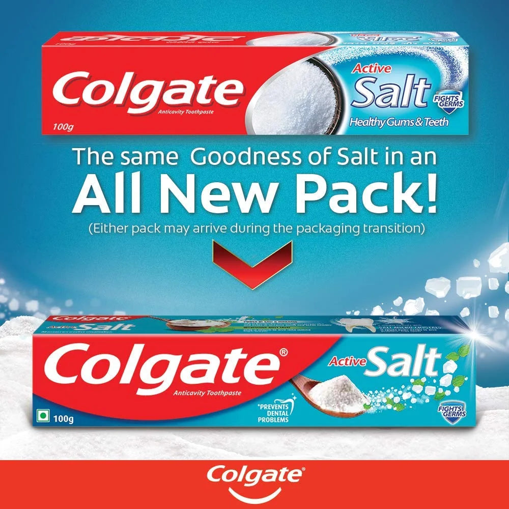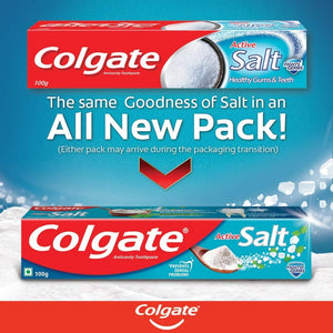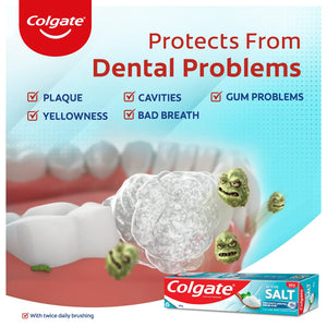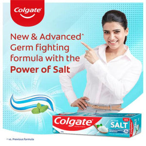 Colgate Active Salt toothpaste fights germs & scrubs them away with the goodness of active salt, known for its antibacterial properties. The Unique formula with salt microcrystals helps elevate daily oral care with stronger prevention of dental problems. Germs are known to cause different dental problems such as cavities, plaque, bad breath, tartar, gum problems, yellowness etc. With Colgate Active Salt, your family can have a worry-free smile as it works to fight these germs for a problem free mouth. It also has refreshing minty extracts that gives you a fresher breath. Colgate Active Salt toothpaste is a daily prevention toothpaste and comes with multiple benefits like preventing cavities, plaque build-up, tartar formation, removes yellow stains, giving you a healthier, whiter smile.?Colgate toothpaste is always 100% vegetarian, gluten-free & Paraben-free. We care about our environment, Colgate India is the nation's first to earn TRUE Zero Waste Platinum certification for all its four manufacturing sites in India, from Green Business Certification Inc. (GBCI). This toothpaste is made in India, with the highest quality standards and comes with 100% recyclable tube.