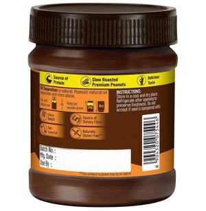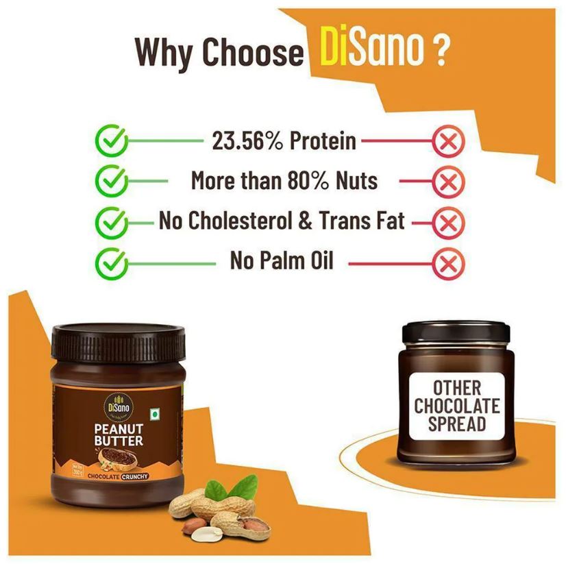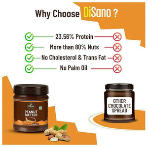 The Disano Chocolate Peanut Butter Crunchy (350 g) offers a delightful mix of 83% roasted peanuts and 10% dark chocolate, delivering a creamy yet crunchy texture with every bite. Packed into a 350 g jar with approximately 11 servings (32 g each), each serving provides 203.20 kcal, 7.36 g protein (13.62% RDA), 16 g total fat (23.88% RDA), 7.44 g carbs, and 2.05 g fibre. It contains sugar, iodised salt, and stabiliser (INS 471) to maintain its rich consistency, with zero trans fat and cholesterol, and 54.40 mg sodium (2.72% RDA). Ideal for spreading on toast, adding to recipes, or enjoying as a tasty, nutty snack!