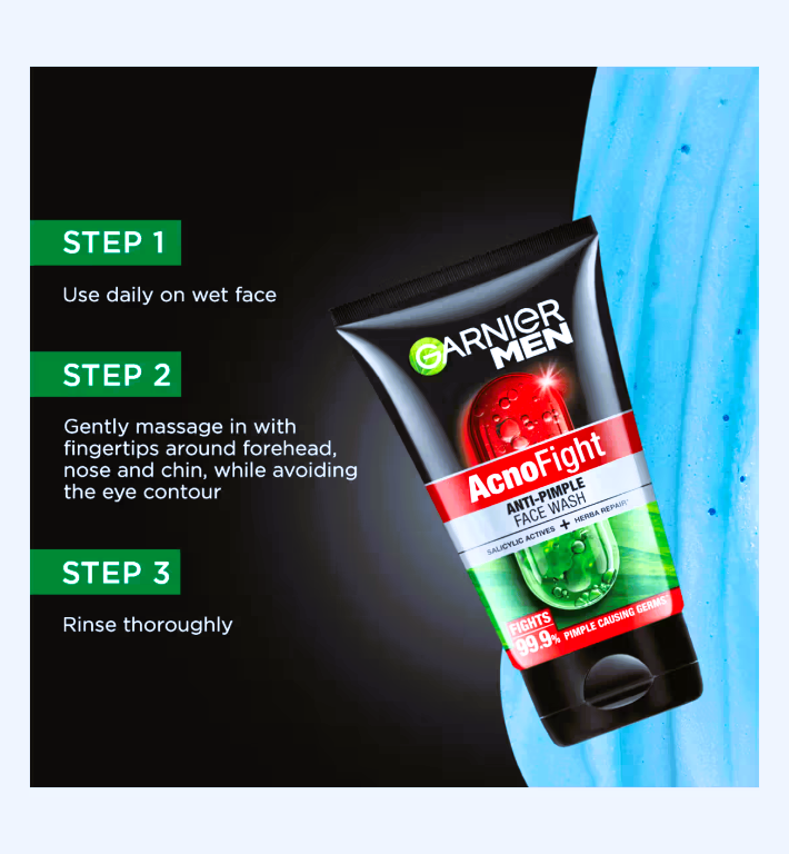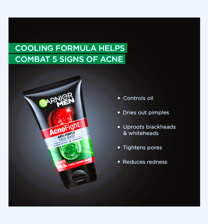 Reveal fresh, bright, and clear skin with the Garnier Men Acno Fight Face Wash. Germs and oil attack men’s skin and clog their pores, giving rise to acne and blackheads. The Acno Fight Facewash fights up to 99.9% of pimple causing germs to dry pimples, uproot blackheads, and give you skin that is clean and refreshed. Formulated with natural ingredients, the anti-acne face wash also helps control excess oil production and regenerates and repairs your skin to give you a healthy glow. The salicylic acid in the Garnier face wash for men neutralizes the bacteria and cleanses the skin while the micro-beads gently exfoliate the skin, unclog the pores, and remove blackheads.