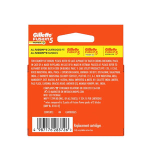 Gillette Fusion Power- Box of four replacement cartridges for the Gillette Fusion razor. It is compatible with all Fusion razor handles. It has a 5-blade shaving surface + 1 precision trimmer for a comfortable, precise shave. This creates a shaving surface that distributes the shaving force across the blades and includes a lubra strip which fades from green to white when shave conditions have been reduced.