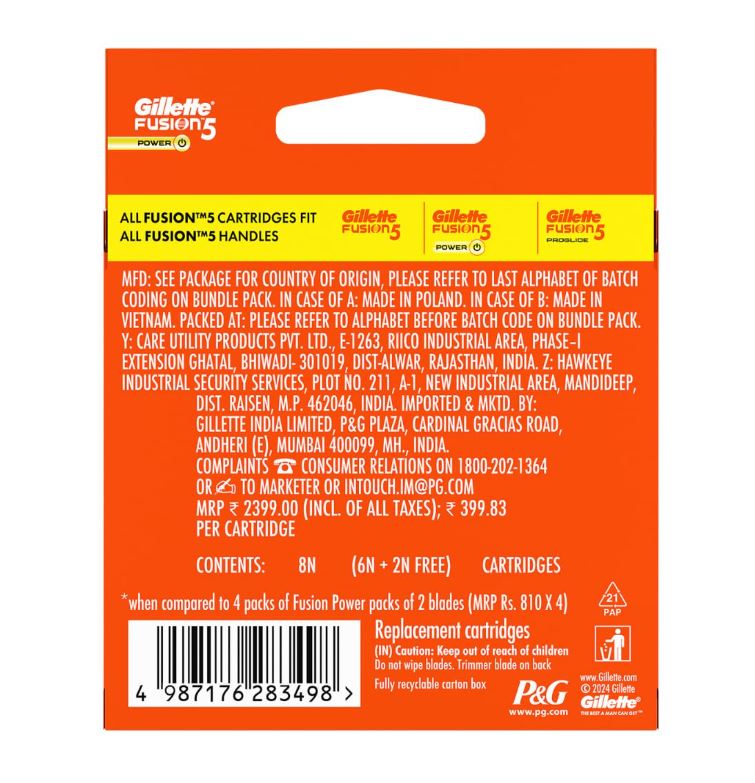 Gillette Fusion 5 Power Razor Cartridges - For Men, (Pack of 8 Cartridges)