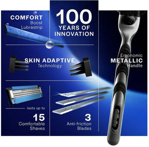 Experience the legacy of close, comfortable shaves with the original Mach3 razor. Its 3-blade technology, combined with the Comfort Guard's 5 Microfins, delivers a smooth and safe shaving experience. The anti-friction blades ensure a close shave with minimal irritation, while the facial adaptive technology allows the razor to seamlessly glide over the curves of your face. Enjoy a clean and precise finish with the triple-blade design, providing a smooth and comfortable shave every time.