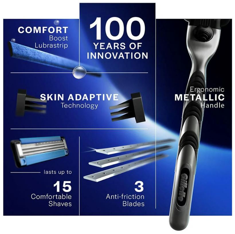 Experience the legacy of close, comfortable shaves with the original Gillette MACH3 razor. Featuring 3-blade technology, this razor delivers a superior shaving experience that lasts. The Comfort Guard with 5 Microfins gently stretches the skin, preparing it for a smooth, close shave. The Indicator Lubrication Strip fades to white, signaling when it's time to replace the blade for optimal performance. Engineered to last for up to 15 comfortable shaves, these razor blade refills offer longevity and convenience. Glide effortlessly over your skin with the secure, ergonomic grip handle, and enjoy a shave that leaves you feeling refreshed and confident.
