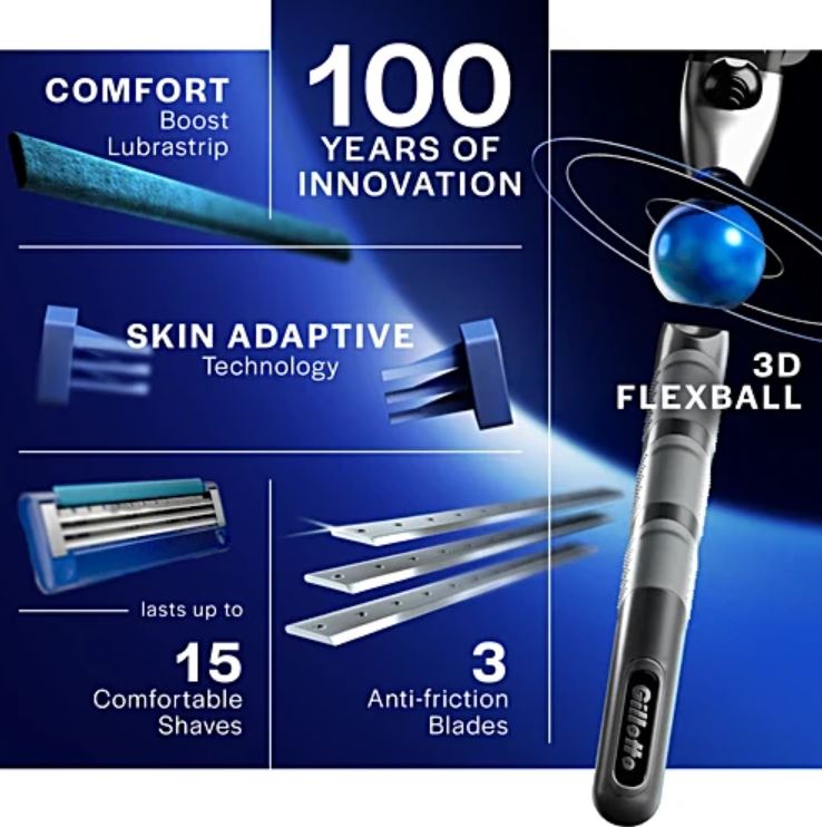 The three blades of the Gillette Mach3 Turbo are treated with an Advanced Anti-Friction Coating, allowing the Mach3 Turbo to remove each hair with less irritation. Soft, protective Microfins gently smooth down the skin, allowing the Mach3 Turbo to shave evenly and effortlessly. The Indicator Lubrication Strip ensures that your Mach3 Turbo razor blade keeps gliding across your skin, shave after shave.
