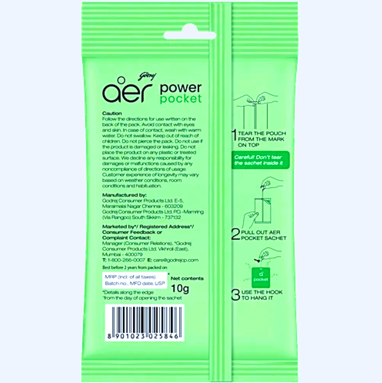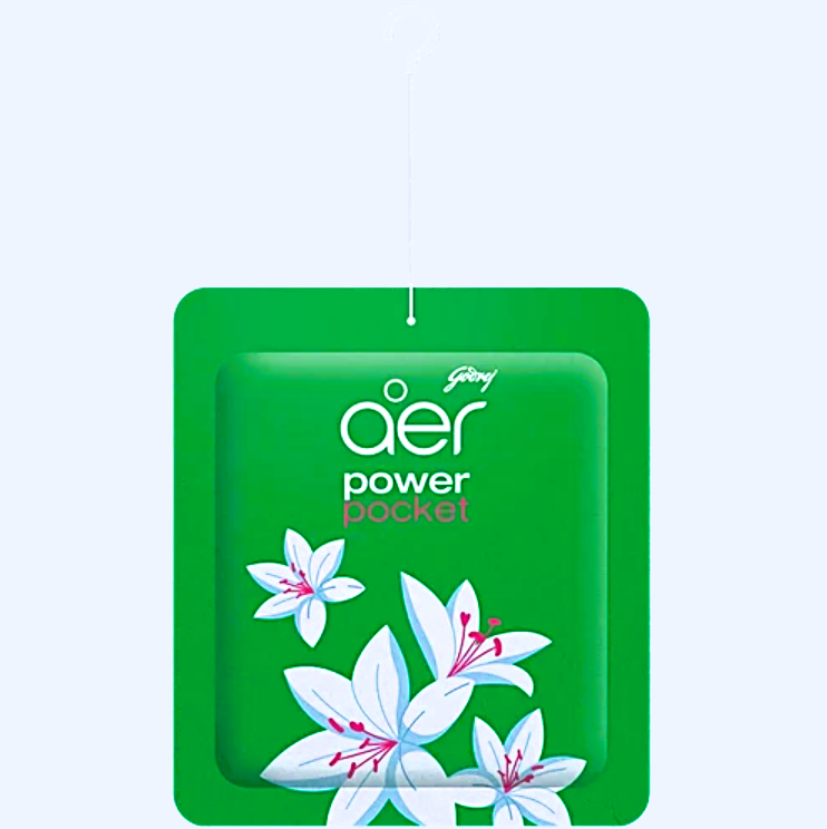 Say hello to Godrej aer Power Pocket, a range of bathroom air fresheners available in 5 delightful fragrances. Its unique power gel technology keeps your bathroom fragrant for 3-4 weeks and ensures that its fragrance reaches every corner of your bathroom. A must-have stock item in your pantry and toilet, Godrej aer Power Pocket is so easy to use, that you simply have to unwrap the packet and hang it with the hook provided. Godrej aer Power Pocket works 24x7 without any effort, so you can walk in to a refreshing fragrance every time you step into your bathroom.