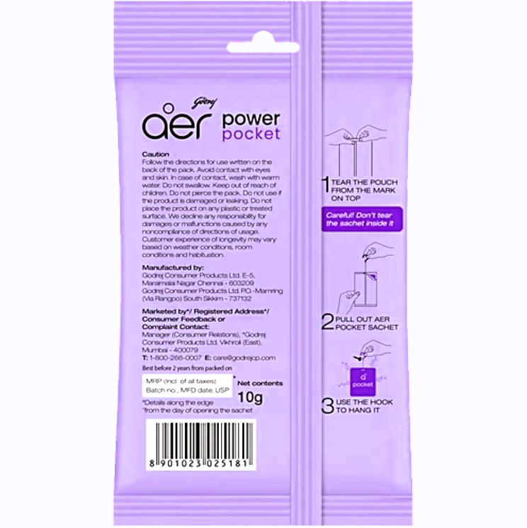 Introducing Godrej Aer Power Pocket, a range of bathroom air fresheners available in 5 delightful fragrances. Its unique power gel technology keeps your bathroom fragrant for 3-4 weeks and ensures that its fragrance reaches every corner of your bathroom. A must-have stock item in your pantry and toilet, Godrej Aer Power Pocket is so easy to use that you simply have to unwrap the packet and hang it with the hook provided. That's it, you are done. Godrej Aer Power Pocket works 24x7 without any effort, so you can walk into a refreshing fragrance every time you step into your bathroom.