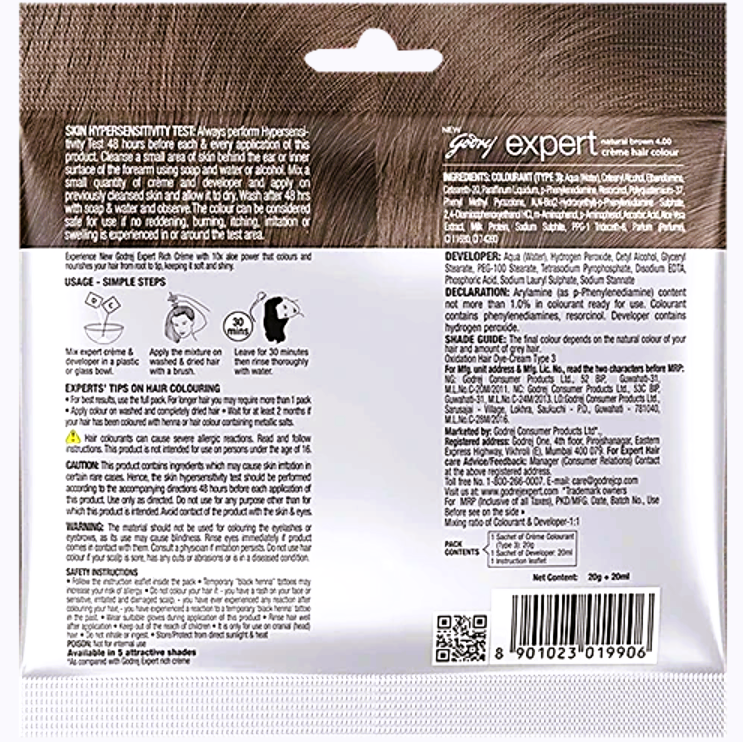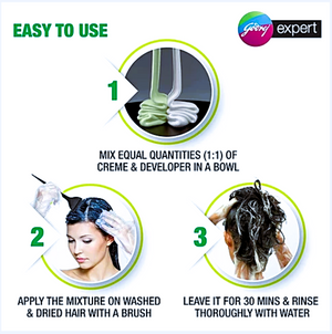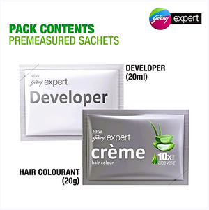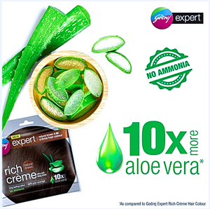 The Godrej Expert Rich Creme Hair Colour mini pack comes with the goodness of 10 x aloe vera. It is no ammonia formula that gives rich colour with softer and shinier looking hair at a reasonable price. It ensures grey coverage. It comes in easy to use pre-measured sachets. No need to measure. Simply cut, mix & apply. It's convenient. Application time is 30 mins only.
