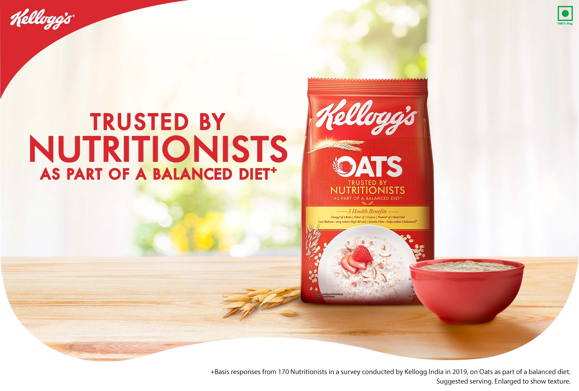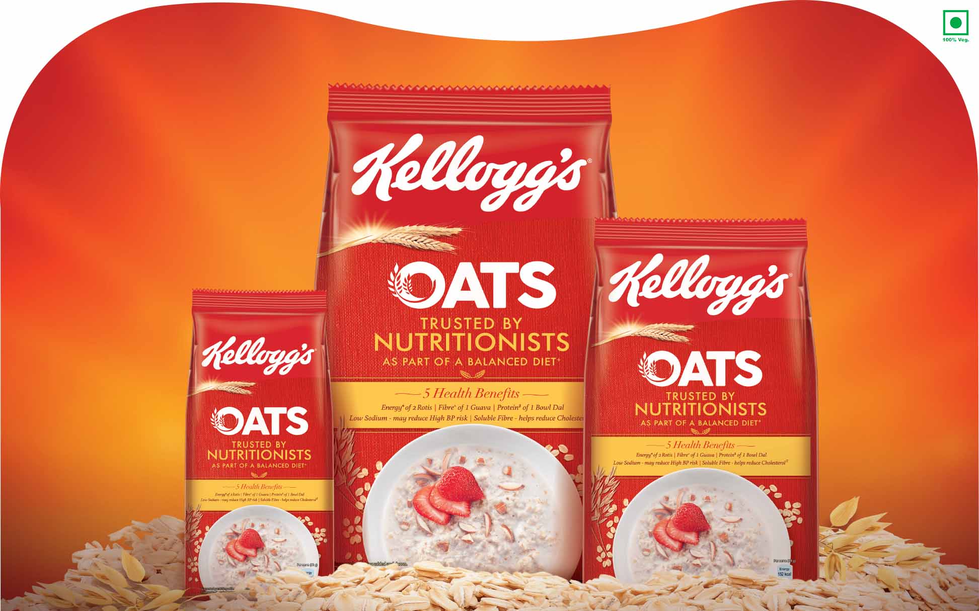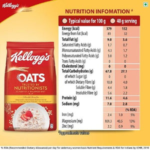 Start your day by taking care of your health with the goodness of Kellogg’s Oats which are quick to prepare and consume. Oats is a wonder grain that has more soluble fibre than some grains like Wheat and Rice. Kellogg’s Oats are 100% whole grain and are high in fibre and protein. Whole grain oats provide energy to keep you going. Oats are low in sodium and foods low in sodium may help reduce the risk of high blood pressure. Naturally cholesterol free and with no added preservatives. Organic: No. Kellogg’s Oats can be made into many delicious recipes every day. These include porridge, tempting dosas, tasty idlis, delectable upmas and savoury pohas and many more, so you can make a smart start to a healthy lifestyle in a yummy way.