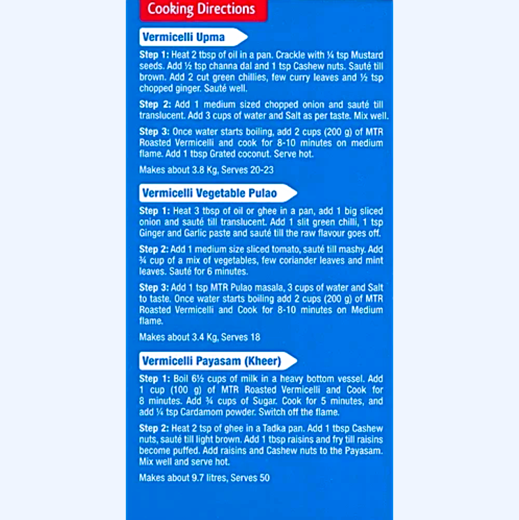 Use the delicious MTR Roasted Vermicelli to make savoury upma or toss it with boiled vegetables for a wholesome pulao or make a creamy sweet kheer for the perfect dessert. They are made from the finest quality hard wheat semolina and pre-roasted which gives your dish irresistible aroma and taste that will leave you wanting for more. It is exceptionally nutritious and healthy meal option to opt for. So go ahead, buy MTR Roasted Vermicelli online today and let your imagination and creativity cut loose in the kitchen and be the perfect homemaker!