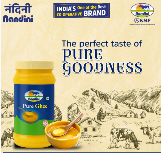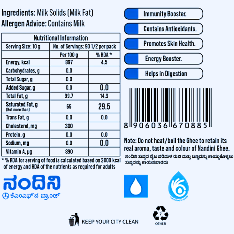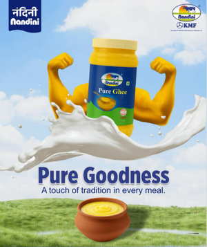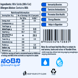A taste of purity, Nandini Ghee is made from pure butter. It is fresh and pure with a delicious flavour. Hygienically manufactured and packed in a special pack to retain the goodness of pure ghee. Available in 200 ml, 500 ml, 1000 ml packs & 15 kg tins.
