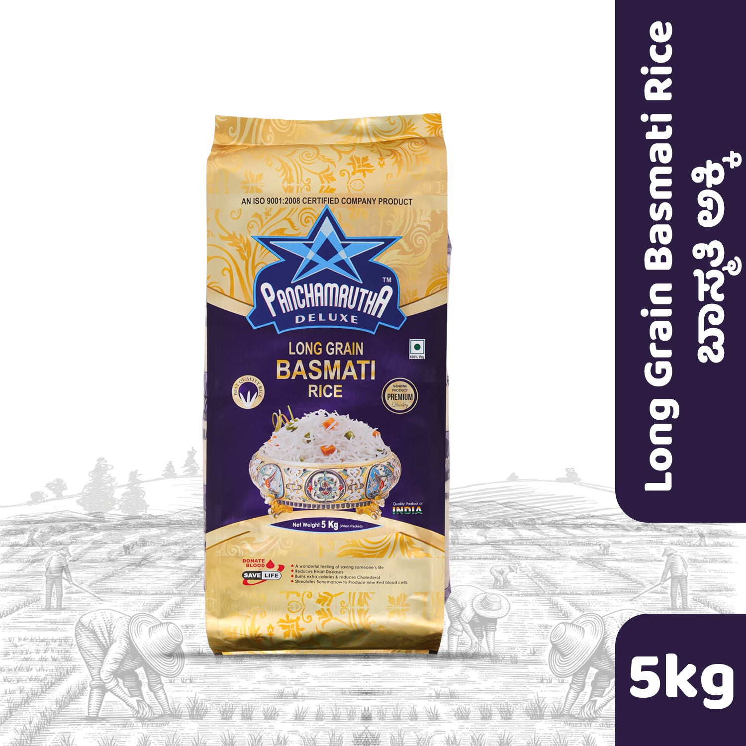 Panchamrutha Deluxe 1121 Basmati Rice (1121 ಬಾಸ್ಮತಿ ರೈಸ್) is a premium extra-long grain variety, naturally aged for at least 12 months to enhance aroma, flavor, and cooking quality. Known for its smooth texture and non-sticky grains, this rice is gluten-free, low in fat, and suitable for everyday meals as well as special occasions.