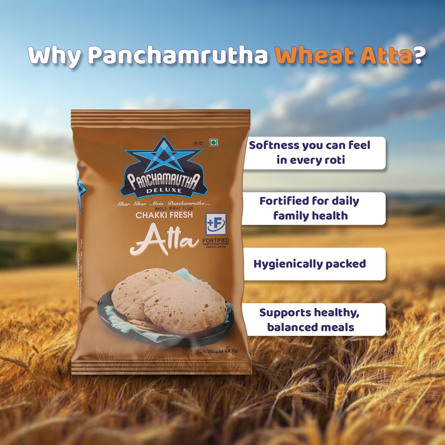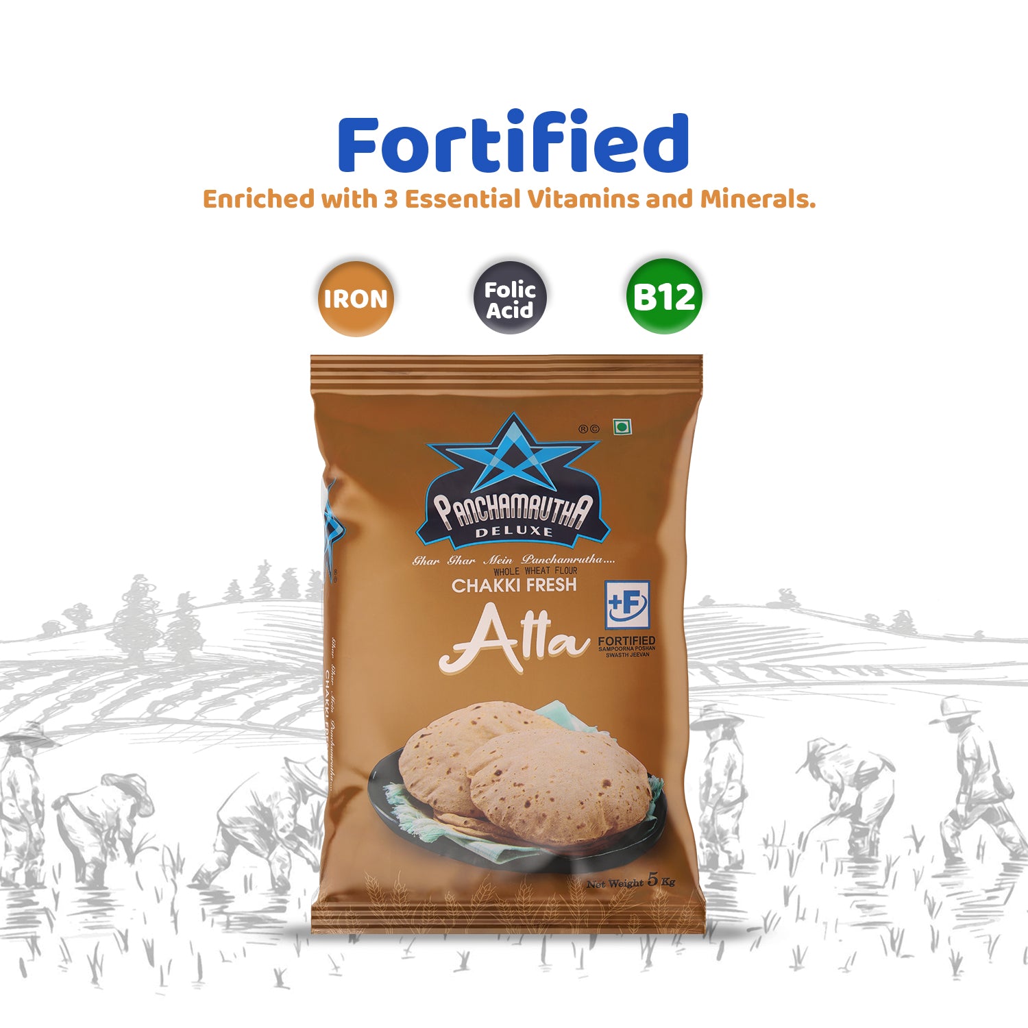 The secret to soft, healthy rotis is here. Panchamrutha Fortified Chakki Atta is a premium-quality flour that brings wholesome goodness to your family's table. Naturally high in fiber for better digestion, our atta is also enriched with 3 essential vitamins and minerals. This simple choice helps you easily add vital nutrients to your family's daily meals, ensuring every roti, chapati, and paratha contributes to their well-being.