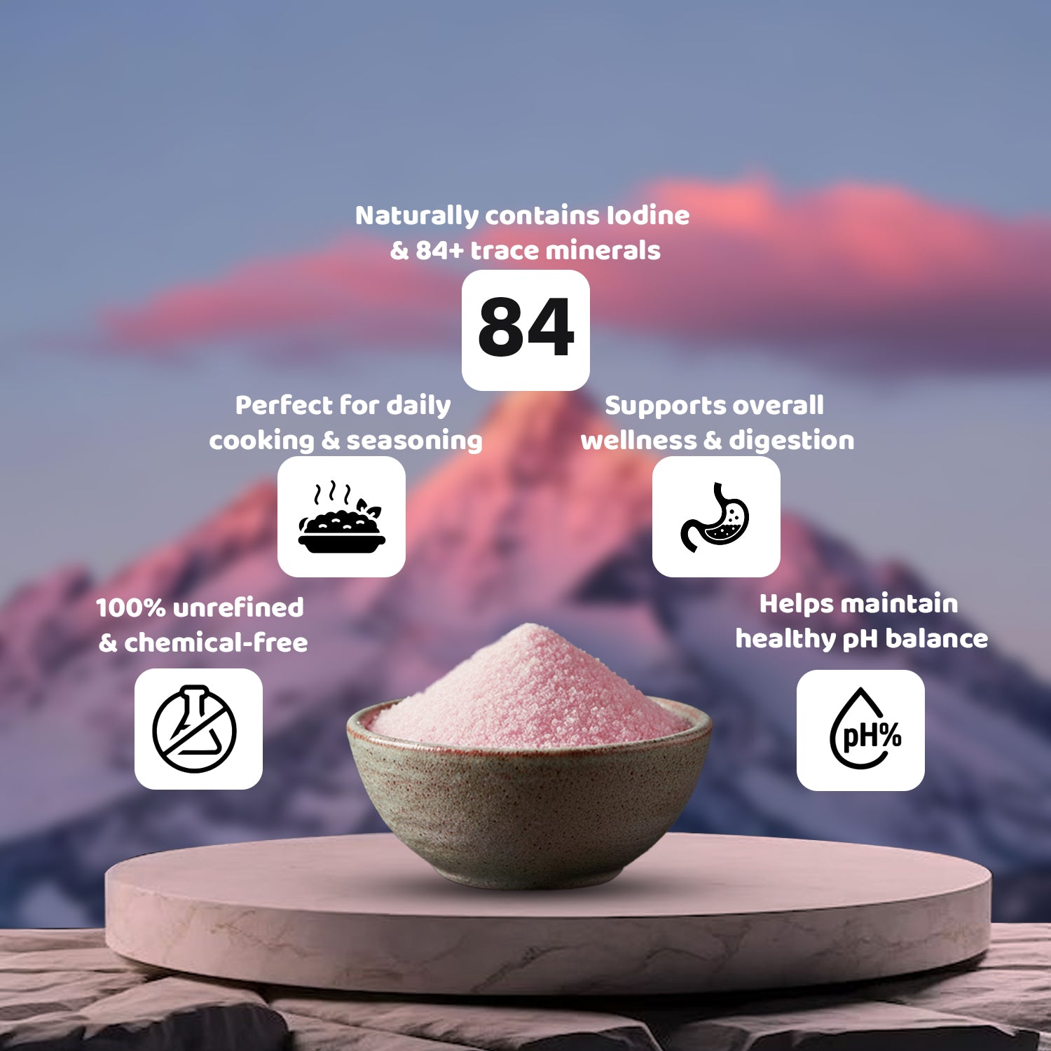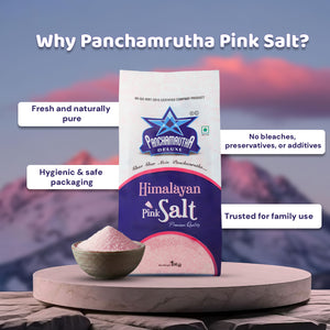 Elevate your cooking with the pure, unrefined goodness of Panchamrutha Deluxe Himalayan Pink Salt. Sourced from ancient salt beds, this natural rock salt is a healthier choice for your family. With its delicate flavor and beautiful pink color, it's perfect for daily cooking, seasoning, and healthy diets.