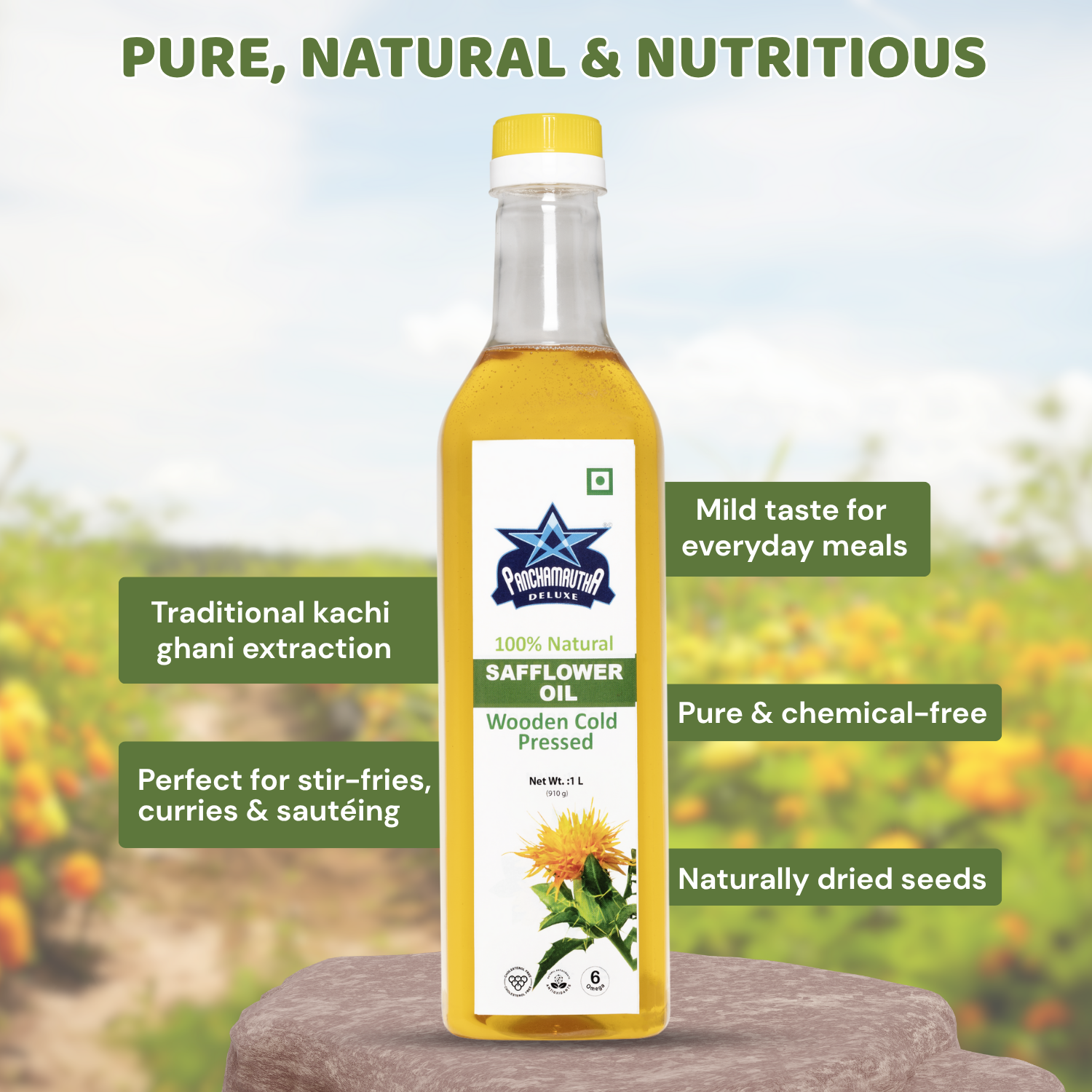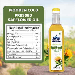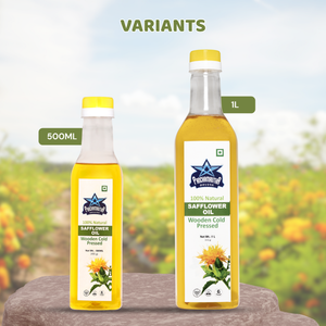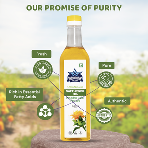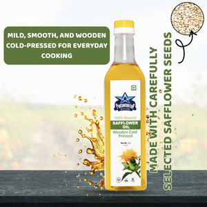 Bring the natural goodness of wooden cold-pressed oil to your kitchen with Panchamrutha Deluxe Safflower Oil. Our safflower oil is different from refined oils. We use a gentle, wooden cold-press method to make sure it keeps its natural nutrients and light flavor. It's perfect for cooking everything from a family meal to your favorite fried foods.