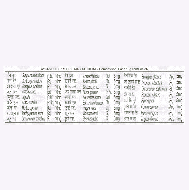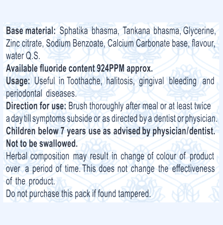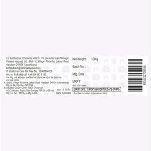 Patanjali Dant Kanti Natural Toothpaste contains various herbs, including akarkara, neem, babool, pudina, loung, pippali, bajranti, vidang, mesvak, and majuphal. While akarkara and babul protect the gums, neem, timbaru, turmeric and cloves remove and offer protection from bacteria. Pudina and pippali refresh the gums. Peelu makes gums stronger.