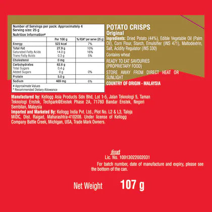 Relish the classic, Pringles Potato Chips in its Original flavour - the perfect snack, loved by everyone for its delicious taste and crispy texture. Uniquely Shaped - Pringles is known for its unique shape, perfectly seasoned from edge to edge, for full savoury goodness in each bite! It's light and crispy and comes in a can. Enjoy On Many Occasions - Pop a can to add some crunch to lunch sandwich, indulge in a midnight munch with your favourite drink, stay energized as you game — grease-free, pack it in a picnic, it’s always more fun with Pringles Potato Chips! Stackable And Convenient - Everyone's favourite stackable chips that are kept unbroken and sealed air-tight with a freshness that pops! You can even stack 'em up to innovate your own flavour combo. Original Flavour- Sometimes simple is best - enjoy your favourite stackable chips in original, pure tantalizing flavour of salted potato - it’s good enough on its own. Unlike other potato chips, Pringles Potato Chips are made from a mix of potato, rice flour, corn flour, and wheat starch.