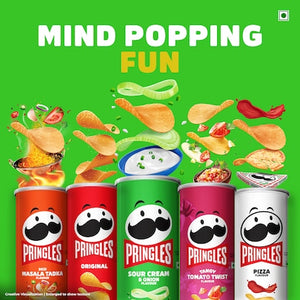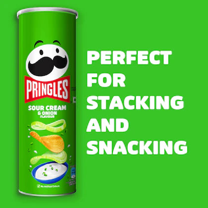 Relish Pringles Sour Cream & Onion Flavoured Potato Chips, a crispy snack loved by everyone for its delicious taste and crispy texture. Pringles Sour Cream & Onion flavoured Potato Chips are irresistibly crispy and lightly salted. Pringles can be enjoyed as an accompaniment to your lunch, on a movie/games night, on picnics, and much more. Pringles is an on-the-go snack which you can carry around. Pringles Sour Cream & Onion flavoured potato snacks would work just perfectly to satiate your hunger. Unlike other potato chips, Pringles chips are made from a mix of potato, rice flour, corn flour, and wheat starch. They are light and crispy and come in a can.