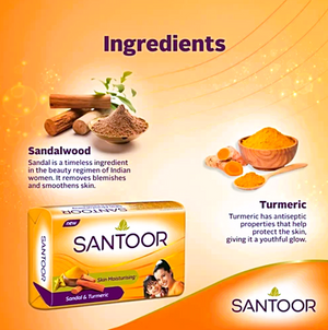 Santoor has evolved from a traditional South Indian soap to a modern beauty soap that contains the secret to younger-looking skin for women of different age groups. Sandal and Turmeric have been essential parts of the Indian woman's skincare regimen for centuries. The deeply acting ingredients of Turmeric and Sandal in the soap provide smooth, soft, and clear skin while also giving a youthful glow to the skin. It has a fresh, energizing, and long-lasting fragrance. It is a great solution for problems such as blackheads, acne, and skin allergies. It removes tanning, cures skin itching, and detoxifies the skin.
