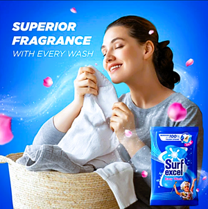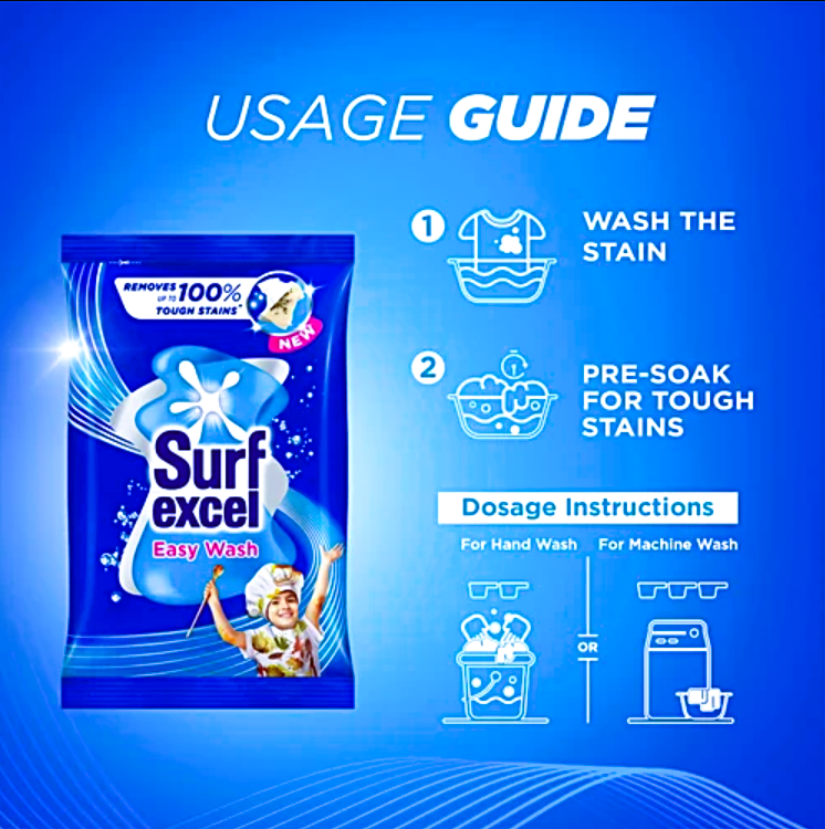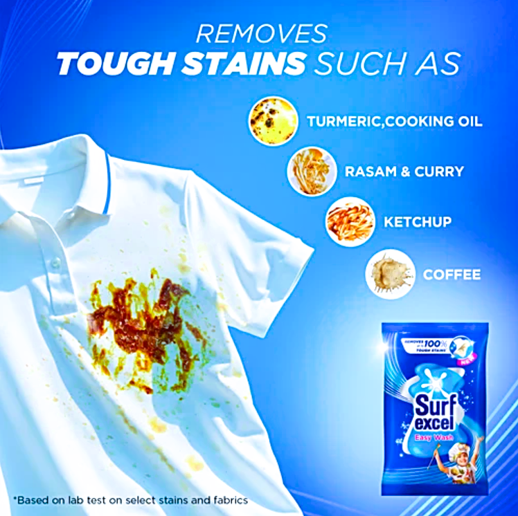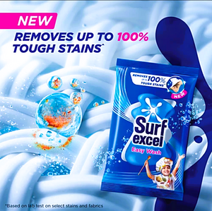 Surf Excel Easy Wash is a superfine powder that removes tough stains in a jiffy and leaves no residue on your clothes. Being a superfine and fluffy powder, it dissolves easily and reaches the stain, removing it easily. Its engineered formula with superior technology unleashes the power of 10 Hands that is effective in removing the toughest of stains such as mud, ink, oil, ketchup, curry stain, and chocolate very easily.